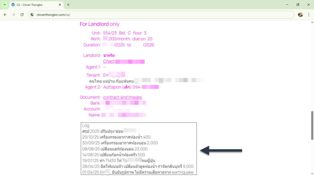 ส่วนที่สองคือบันทึก (Log) กิจกรรมรายรับ-รายจ่าย พร้อมสรุปผลรายปี เพื่อให้เจ้าของห้องสามารถวิเคราะห์ผลการดำเนินงานของห้องพักในเชิงการลงทุนได้