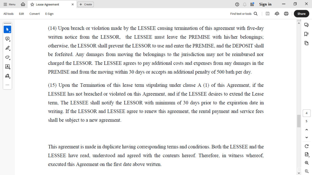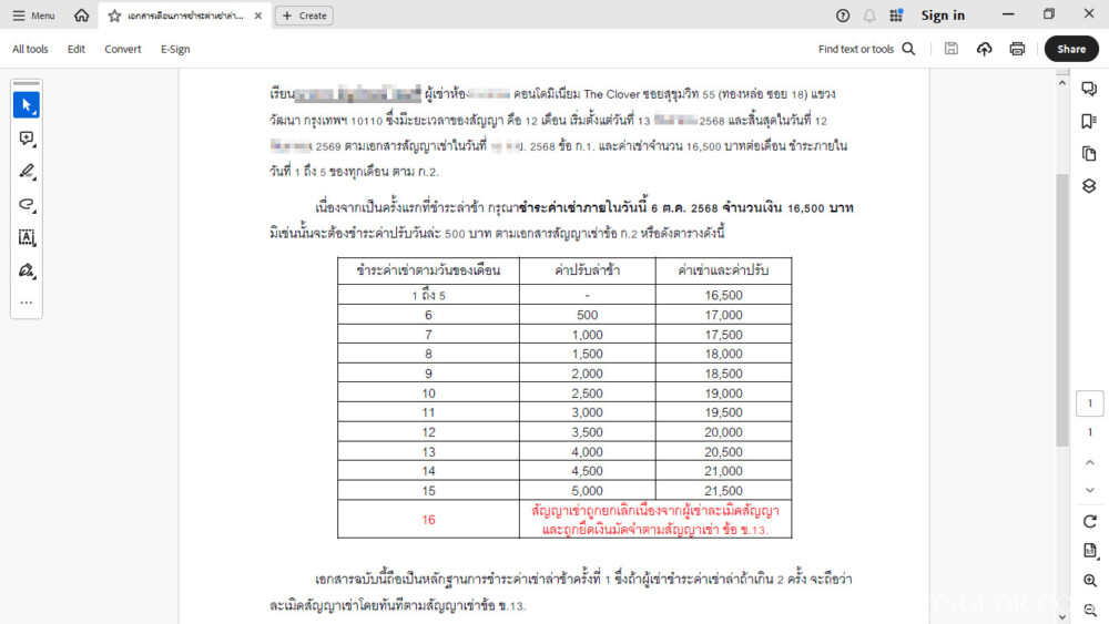 ชี้แจงสัญญาเช่า เช่น ค่าปรับล่าช้า การยกเลิกสัญญาจากความผิดของผู้เช่า รวมถึงออก/ส่งเอกสารคำเตือนถึงผู้เช่า