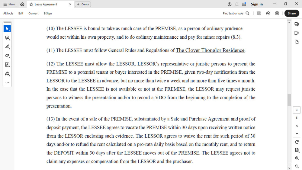บางกรณีที่ผู้เช่าปฎิเสธการเข้าชม (12) และ (13) โดยอ้างว่าไม่สะดวกหรือไม่อยู่ห้อง ทำให้เจ้าของเสียโอกาสในการหาผู้เช่าใหม่/ผู้ซื้อ ดังนั้นในเอกสารควรระบุให้ชัดเจน และให้ความเป็นธรรมต่อผู้เช่าปัจจุบันภายใต้กฎหมายคุ้มครองผู้บริโภค (ไม่ควรเขียนสัญญาตามใจ หรือที่ผิดต่อบทตัวกฎหมาย) ส่วนข้อ (14) เกี่ยวข้องกับยกเลิกสัญญาและให้ผู้เช่าย้ายออก
