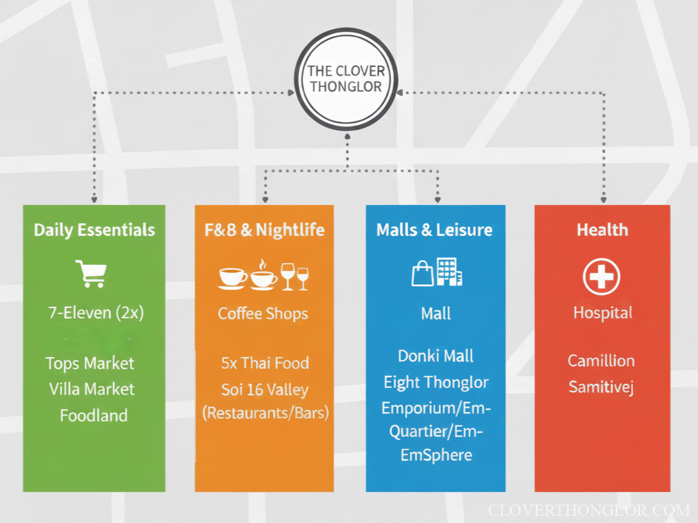 Tops market is accessible via a rear gate of Building A (parking lot) with 3-minute walk. Other supermarkets are Villa in Soi 15 and Foodland in Eight Thonglor Soi 8.